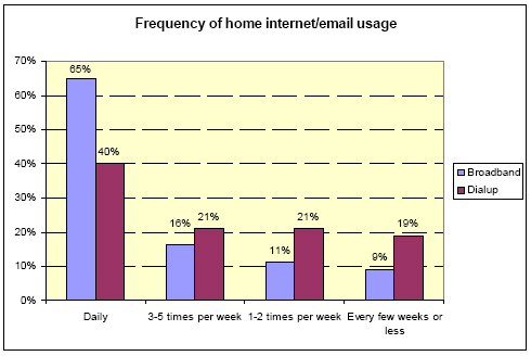 Previous Pew Internet Project research has highlighted the strong relationship between high-speed internet access and the richness and intensity of the online experience. Compared with individuals with a dialup internet connection, broadband users use the internet more regularly and engage more frequently in a variety of online activities.6