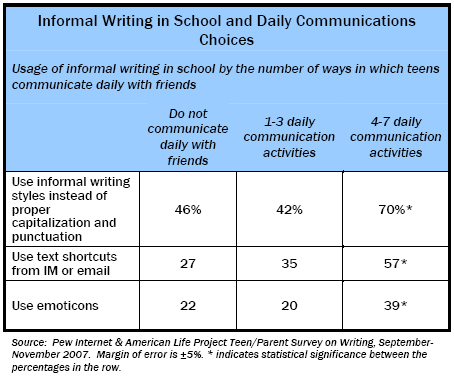 Teens who communicate regularly with their friends through a wide range of communications channels are more likely than less “communicative” teens to incorporate informal or technology-related elements into their school writing. The more types of personal daily communications teens engage in with friends, the more likely they are to incorporate these conventions into the writing they do at school.
