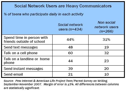 While social networking sites are used intensively for communications between friends, these sites supplement rather than replace existing modes of communication. Social networking teens are more likely than non-social networking teens to participate in a wide range of daily communications activities, from in-person interactions with friends to talking on the telephone or sending IMs or text messages.