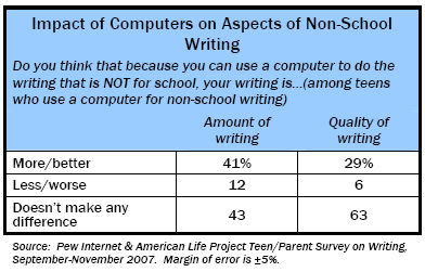Teens feel that computers contribute more to the quantity of their non-school writing than to its quality.