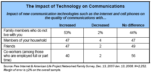 Cell phones and the internet are seen as positive tools for improving the quality of communications with family members, particularly those who live elsewhere.