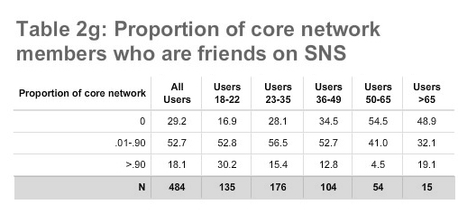 - 18% of all SNS users listed more than 90% of all their core network members as SNS “friends.”