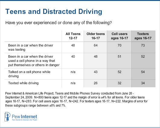 Fully 73% of texting teens ages 16-17 have been in a car when the driver was texting.