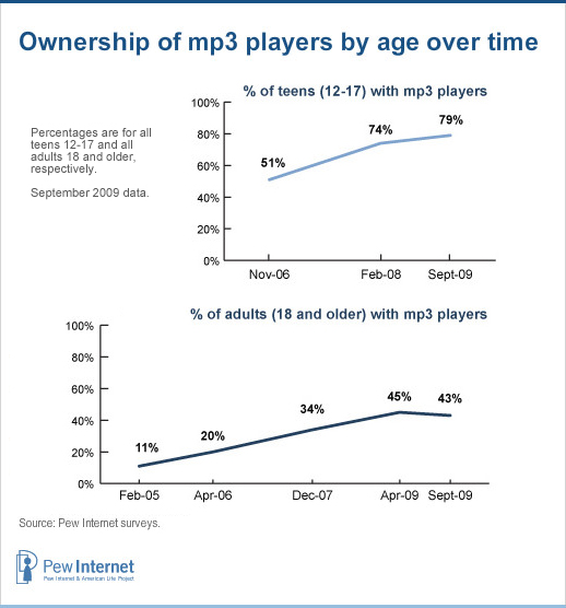 Ownership of mp3 players by adults has risen steadily since the question was first asked in January 2005, when just 11% of adults owned a digital music player. Among teens, the percentage of teens with an mp3 player has also increased significantly, from 51% of teens in November 2006 to nearly 80% today.