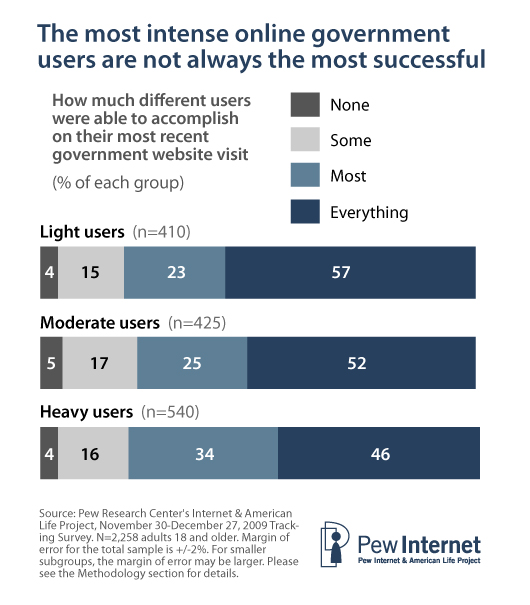 Interestingly, heavy online government users are actually less likely than light or moderate users to have accomplished everything they wanted to do on their last visit to a government website. More than half (57%) of light online government users accomplished everything they were trying to do on their last visit to a government website, compared with 46% of heavy users. Heavy users were more likely to say that they accomplished “most” of what they were trying to do—34% said this, compared with 23% of light users. It is unclear why heavy users are less likely to accomplish all of what they need to do, although it is possible that these users are attempting to perform more complex tasks that require both online and offline contact—as noted above, the heaviest online users were especially likely to contact government offline as well.