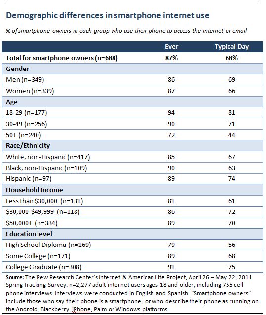 Nearly nine in ten smartphone owners (87%) use their phones to access the internet or email, with 78% of these users saying that they go online using their phone on a typical day.4 Put differently, that means that on a typical day 68% of all smartphone owners go online using their phone.
