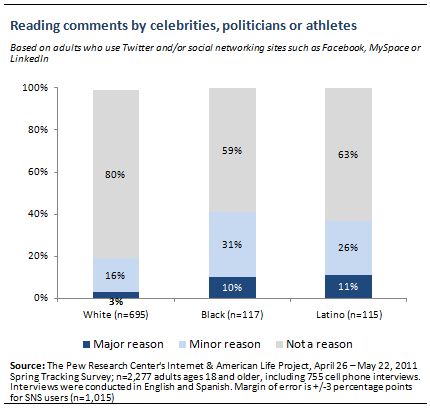 Among social media users as a whole, the ability to read comments by public figures such as politicians, celebrities or athletes does not come into play as a major factor—fully three quarters of users say that this plays no role whatsoever in their decision to use these sites. And while connecting with public figures has a relatively modest impact on users across a range of groups, both African Americans and Latinos show more interest in this activity than white users. One in ten black social media users (10%) and 11% of Latinos say that reading comments from public figures is a major reason for using these sites (compared with just 3% of white users). Black and Latino social media users are also more likely to say that this is a minor factor (31% of blacks and 26% of Latinos say this, compared with 16% of whites).