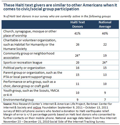 The Haiti text donors in our survey are about as active in social or civic groups as other Americans