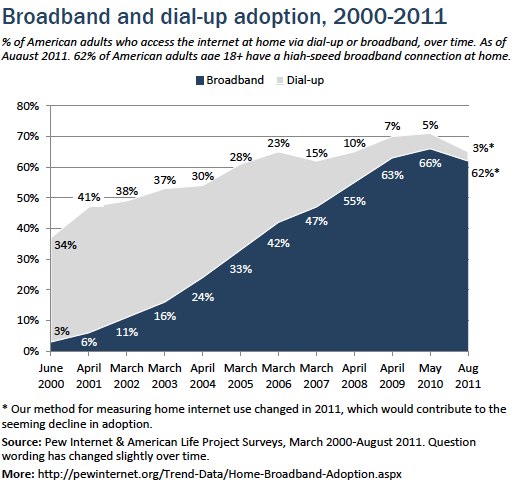 In February 2001, when about half of adults were online, only 4% of American households had broadband access; as of August 2011, about six in ten American adults (62%) have a high-speed broadband connection at home.28 Men are more likely than women to have home broadband, and whites are more likely than minorities. We also see clear patterns in home broadband adoption by age, household income, and education.
