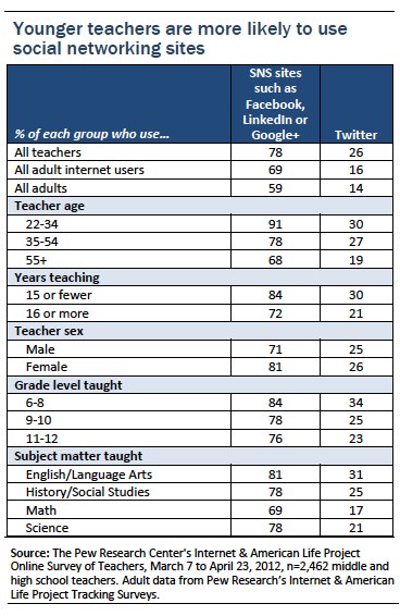 As is the case with both teens and adults nationwide, the most popular social networking site among teachers is Facebook, used by 73% of social networking teachers. Ranking a distant second in popularity among this group is YouTube (used by 32%), followed by LinkedIn and Google+ (each used by 28%).