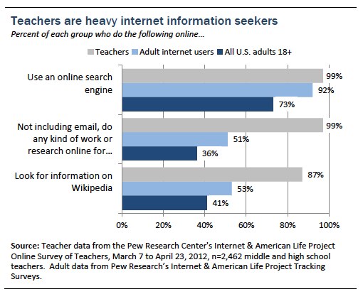 - Second to search engines was the use of Wikipedia or other online encyclopedias, which 75% of teachers said their students were “very likely” to use in a typical research assignment