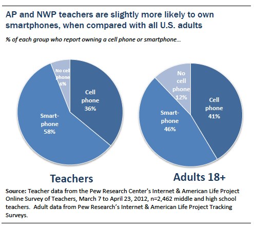 As with the full U.S. adult population, these AP and NWP teachers are very heavy cell phone users. Overall, 94% say they own a cell phone, which is slightly above the national figure of 88% for all U.S. adults. More notably, among this group of teachers, 58% say their phone is a smartphone. This is more than 10 percentage points higher than the 46% of all adults who report having a smartphone in the most recent Pew Internet survey in December 2012.