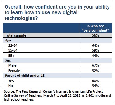 Among this group of teachers, those most likely to feel their students are more knowledgeable about new digital technologies are those age 55 or older (59% say their students know more than they do), female teachers, and those who do not have young children at home. These are the same groups who express the least confidence in their ability to learn to use new digital tools.
