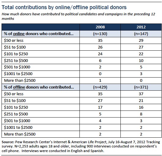 - 56% of online donors (and 58% of offline donors) contributed $100 or less this year to political candidates and campaigns.