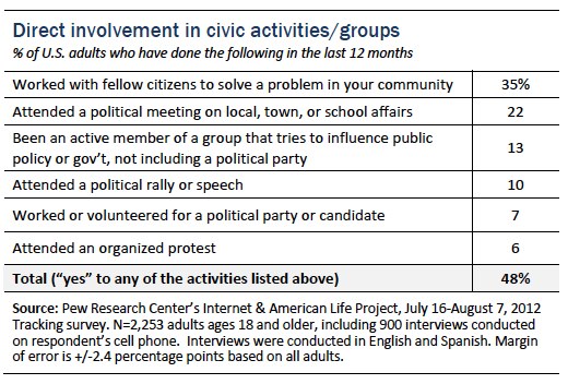 Half of the adult U.S. population (48%) has been directly involved in a civic group, or has taken part in some kind of “in person” activity around a political or social issue in the 12 months preceding our August 2012 survey. We came to this figure by asking about six different political activities that people might take part in (see the table below for a full list) and found that 48% of Americans have done at least one of them (with that group being evenly split between those who did a single activity out of the six we measured and those who took part in multiple activities).