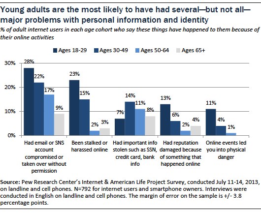 Online younger adults—those ages 18-29—are the most likely to have experienced some of these troubles, including have an email or social media account taken over, being stalked or harassed online, suffering reputational damage, or being in physical danger based on online events.