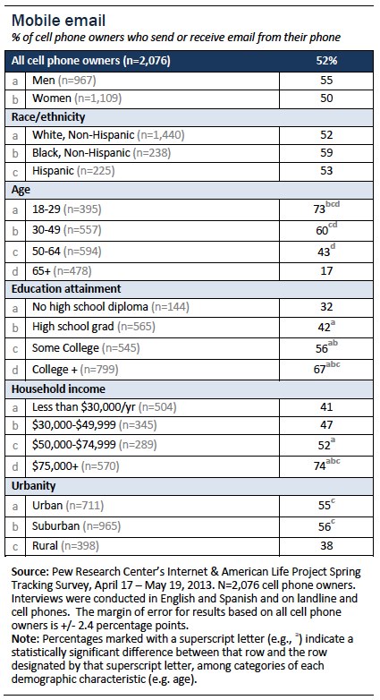 Half of cell owners send or receive email from their phone. The activity is most popular among younger adults, the well-educated, those in higher income brackets, and urban and suburban-dwellers.