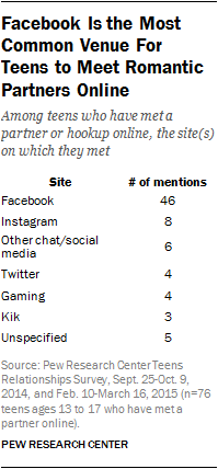 Pew Research CenterSeptember 29, 2015 Teens, Technology and Romantic RelationshipsFacebook Is the Most Common Venue For Teens to Meet Romantic Partners Online