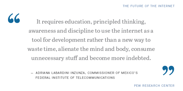 Some 1,150 experts responded in this non-scientific canvassing. Some 47% of these respondents predict that individuals’ well-being will be more helped than harmed by digital life in the next decade, while 32% say people’s well-being will be more harmed than helped. The remaining 21% predict there will not be much change in people’s well-being compared to now. Below are some of their responses.