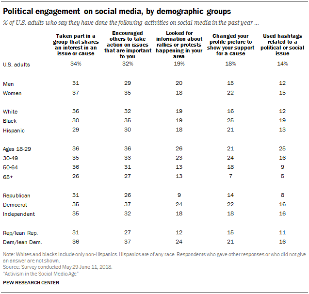 Report | July 11, 2018 Activism in the Social Media Age Appendix A: Detailed tables X Facebook Threads LinkedIn WhatsApp Mail Print Add Us On Google By Monica Anderson, Skye Toor, Kenneth Olmstead, Lee Rainie and Aaron Smith Table of Contents Activism in the Social Media Age 1. Public attitudes toward political engagement on social media 2. An analysis of #BlackLivesMatter and other Twitter hashtags related to political or social issues Acknowledgments Methodology Appendix A: Detailed tables ← Prev Page 1 2 3 4 5 6 Next Page → Report PDFToplineAmerican Trends Panel Wave 35