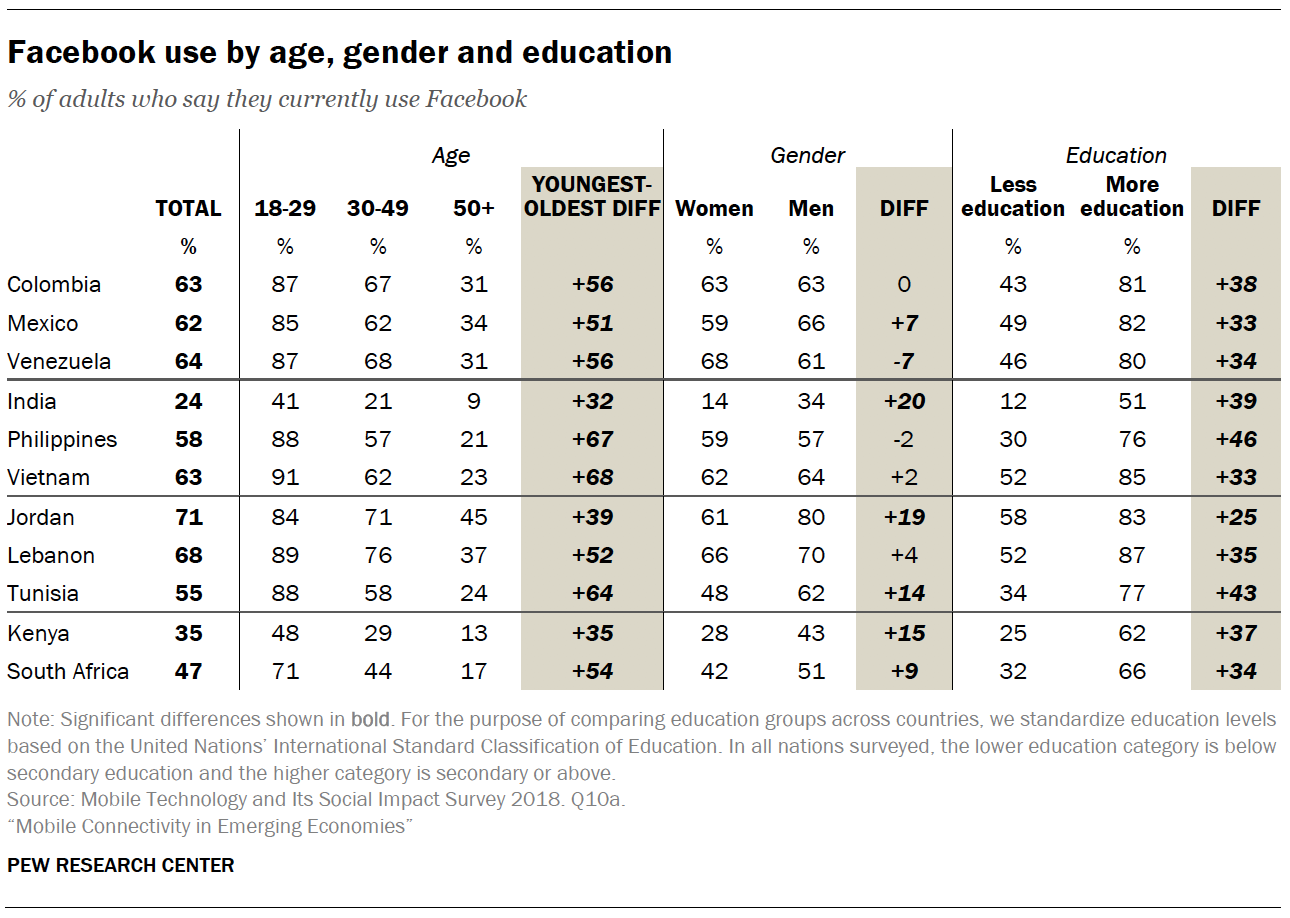 Report | March 7, 2019 Mobile Connectivity in Emerging Economies Appendix C: Detailed tables X Facebook Threads LinkedIn WhatsApp Mail Print Add Us On Google By Laura Silver, Aaron Smith, Courtney Johnson, Jingjing Jiang, Monica Anderson and Lee Rainie Table of Contents Mobile Connectivity in Emerging Economies 1. Use of smartphones and social media is common across most emerging economies 2. Majorities say mobile phones are good for society, even amid concerns about their impact on children 3. People say the internet brings economic and educational benefits – but some are concerned about the societal impact of social media Acknowledgments Methodology Appendix A: About the focus groups Appendix B: Compiled usage figures Appendix C: Detailed tables ← Prev Page 1 … 4 5 6 7 8 9 Next Page → Report PDFToplineMobile Technology and Social Impact 2018