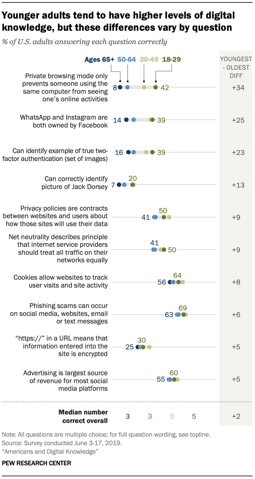 This survey consisted of 10 questions designed to test Americans’ knowledge of a range of digital topics, such as cybersecurity or the business side of social media companies. The median number of correct answers was four. Only 20% of adults answered seven or more questions correctly, and just 2% got all 10 questions correct.