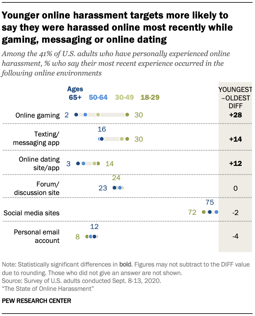 Younger adults who have been harassed online are also more to say their most recent encounter was while online gaming. Three-in-ten online harassment targets ages 18 to 29 say their most recent experience was while online gaming, compared with 14% of online harassment targets who are 30 to 49. Even smaller shares of targets ages 50 to 64 or 65 and older say the same.