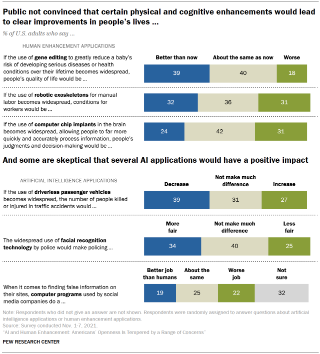 Less than half of the public believes these technologies would improve things over the current situation. One factor tied to public views of human enhancement is whether people think these developments would make life better than it is now, or whether reliance on AI would improve on human judgment or performance. On these questions, less than half of the public is convinced improvements would result.