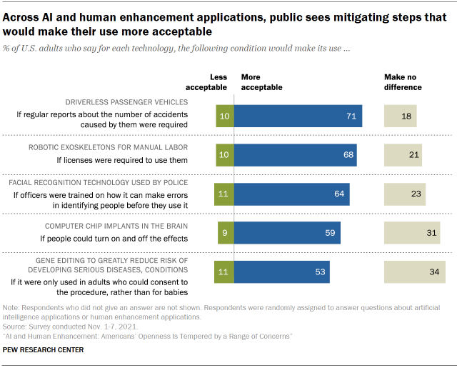 Even for far-reaching applications, such as the widespread use of driverless cars and brain chip implants, there are mitigating steps people say would make them more acceptable. A desire to retain the ability to shape their own destinies is a theme seen in public views across AI and human enhancement technologies. For even the most advanced technologies, there are mitigating steps – some of which address the issue of autonomy – that Americans say would make the use of these technologies more acceptable.
