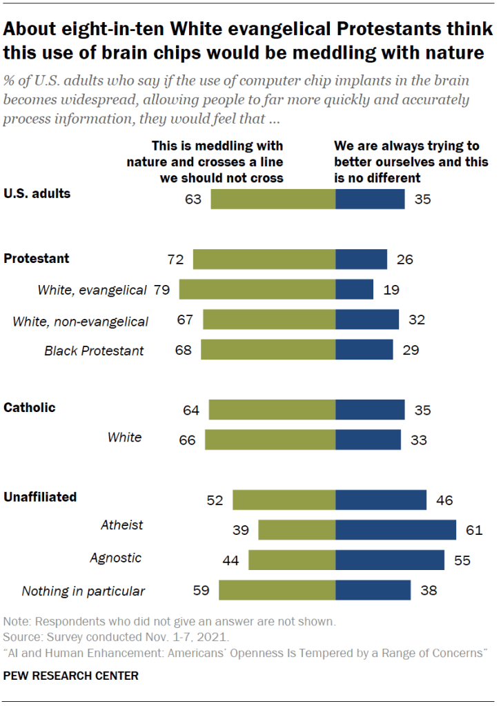 Report | March 17, 2022 AI and Human Enhancement: Americans’ Openness Is Tempered by a Range of Concerns Appendix X Facebook Threads LinkedIn WhatsApp Mail Print Add Us On Google By Lee Rainie, Cary Funk, Monica Anderson and Alec Tyson Table of Contents AI and Human Enhancement: Americans’ Openness Is Tempered by a Range of Concerns 1. How Americans think about artificial intelligence 2. Public more likely to see facial recognition use by police as good, rather than bad for society 3. Mixed views about social media companies using algorithms to find false information 4. Americans cautious about the deployment of driverless cars 5. What Americans think about possibilities ahead for human enhancement 6. Public cautious about enhancing cognitive function using computer chip implants in the brain 7. Americans are closely divided over editing a baby’s genes to reduce serious health risk 8. Mixed views about a future with widespread use of robotic exoskeletons to increase strength for manual labor jobs Acknowledgments Methodology Appendix ← Prev Page 1 … 7 8 9 10 11 12 Next Page → Report PDFToplineAmerican Trends Panel Wave 99