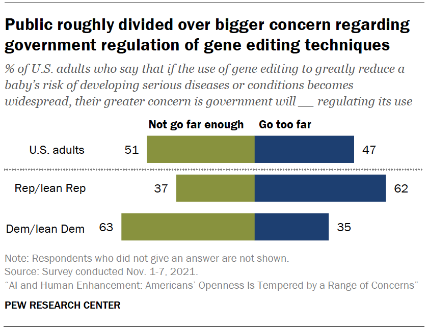 Democrats and Republicans differ widely on this question, consistent with their broader views on government regulation. A majority of Republicans and Republican-leaning independents (62%) say that if gene editing to reduce a baby’s risk of developing a serious disease or condition becomes widespread, their greater concern is that government will go too far in regulating the use of this technology. Among Democrats and Democratic leaners, 63% say their greater concern is that government regulation will not go far enough.