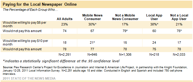 In what may be a positive sign to news organizations, adults who consume their news on mobile devices are more likely than other adults to say they would be willing to pay a fee. Mobile news consumers are almost twice as likely as other adults to say they would pay a $5 monthly fee for access to their local newspaper online (30% vs. 17%). And among local app users, 38% are willing to pay that amount. There is less enthusiasm among mobile news consumers and local app users when the proposed fee is $10 per month.