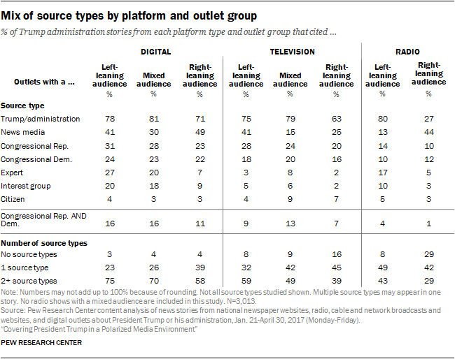 For example, stories on a digital platform were overall much more likely to name multiple source types than stories from both television and radio. Looking at just digital content, though, three-quarters of stories from outlets with a left-leaning audience cited two or more sources, 17 percentage points higher those from outlets with a right-leaning audience (58%). The same pattern holds for both television and radio.