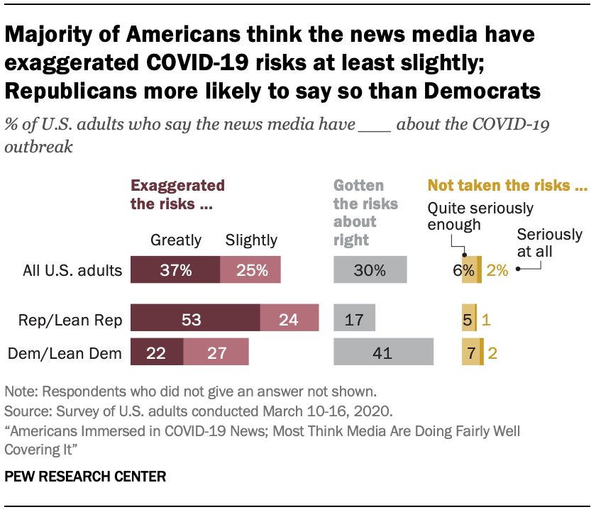 Republicans sense greater exaggeration from the news media than Democrats. About half (53%) say the news media have greatly exaggerated the risks associated with the virus, and another 24% say the news media have slightly exaggerated the risks. Fewer than two-in-ten (17%) say the news media have gotten it about right. Democrats, for their part, are more than twice as likely as Republicans to say the news media have gotten the level of risk about right (41%). Still, they are most likely to say the risks have been exaggerated (49% in all). (This survey question was also asked about Donald Trump, Democratic leaders in Congress and the CDC. Those responses also differ by party, the details of which can be found in this accompanying report.)