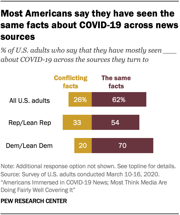 A majority of U.S. adults (62%) say the various sources they turn to have mostly provided the same set of facts about the coronavirus outbreak. Far fewer (26%) say they have seen conflicting facts. And about one-in-ten (11%) say they haven’t turned to multiple sources for this news.