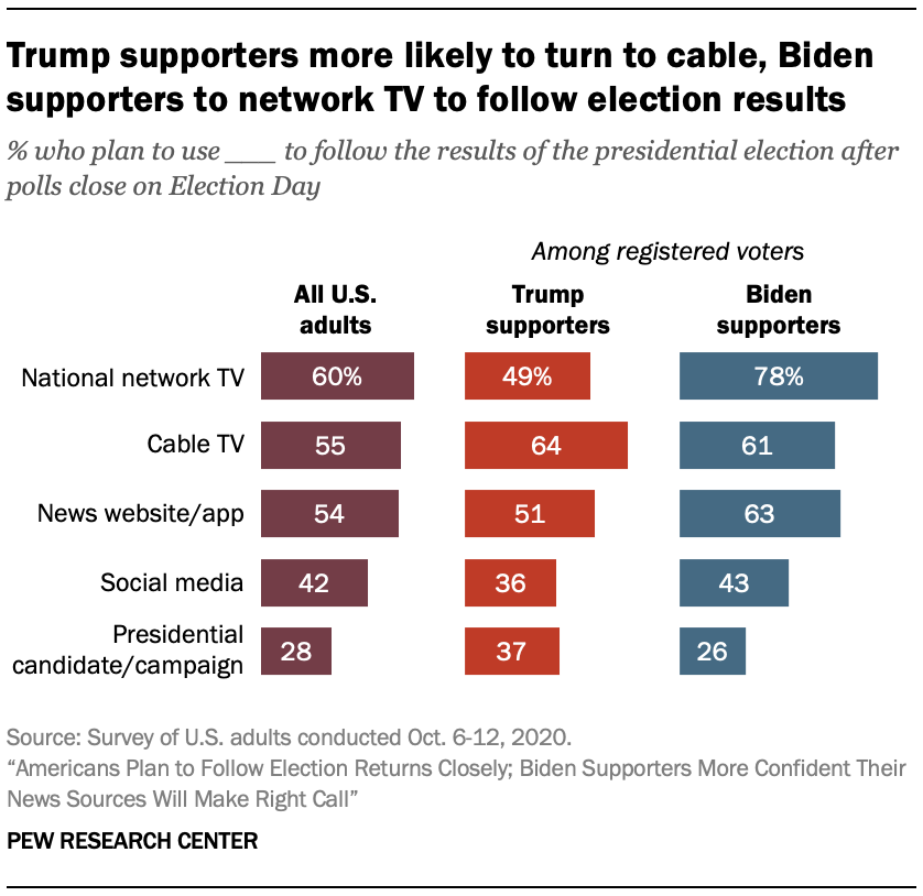 A number of viewing differences emerge between Trump and Biden supporters. Fully 78% of registered voters supporting Biden plan to turn to network TV. Far fewer Trump supporters (49%) plan to do the same. Biden supporters are also more likely to say news websites and apps will be in their mix: 63% vs. 51%. In contrast, Trump supporters look in greater numbers to a presidential candidate or their campaign. Roughly four-in-ten Trump supporters (37%) say they will follow results this way, compared with 26% of Biden supporters.