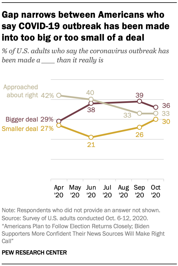 The public’s assessment of whether the coronavirus outbreak has been exaggerated or underplayed also shifted slightly after the White House infection. Overall, 36% of U.S. adults say the outbreak has been made into a bigger deal than it really is, while 30% say it has been made into a smaller deal than it really is and 33% say it has been approached about right. The 6 percentage point gap between those who say it has been exaggerated and those who say it has been underplayed is down from a gap of 13 percentage points in September (39% vs. 26%). And it is the narrowest gap since late April, when 29% said the outbreak was being made into a bigger deal than it really was and 27% said it had been underplayed.