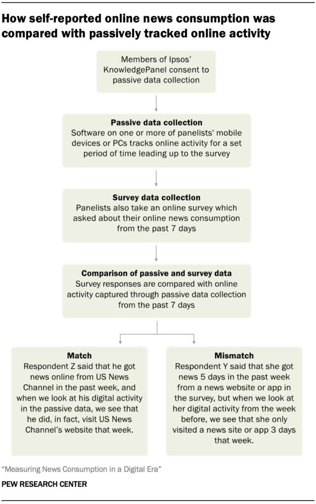 The advantage of passive data is that it does not rely on people’s self-reporting of their own behavior, which can be subject to both imperfect recall and aspirational responses by those who value the news but do not actually consume it at the levels they say they do. A second advantage of passive data collection is that it arguably reduces the burden on respondents, removing the need for them to answer questions about their digital behavior.