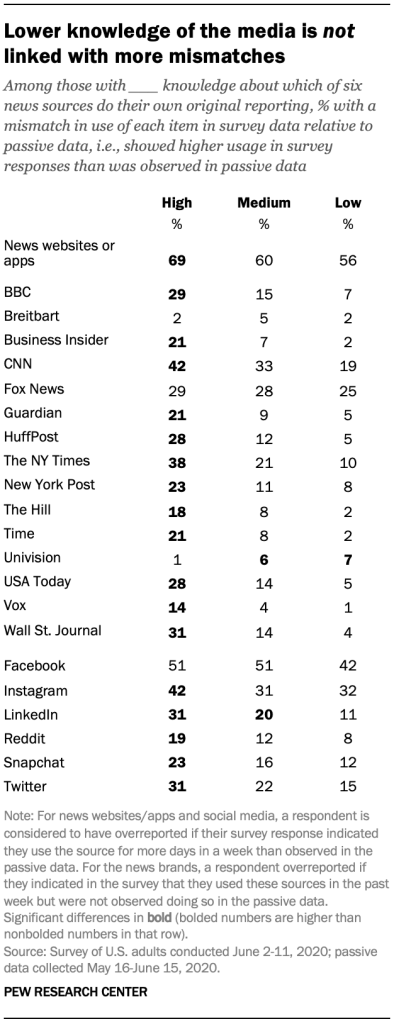 Aside from aspirational overreporting, it is possible that respondents could have cognitive difficulty in accurately recalling their news consumption habits over the past week with the specificity required. Those with higher knowledge of the news media may have more accurate recall of where they got news from online.