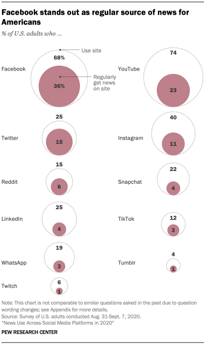 Among 11 social media sites asked about as a regular source of news, Facebook sits at the top, with about a third (36%) of Americans getting news there regularly. YouTube comes next, with 23% of U.S. adults regularly getting news there. Twitter serves as a regular news source for 15% of U.S. adults.