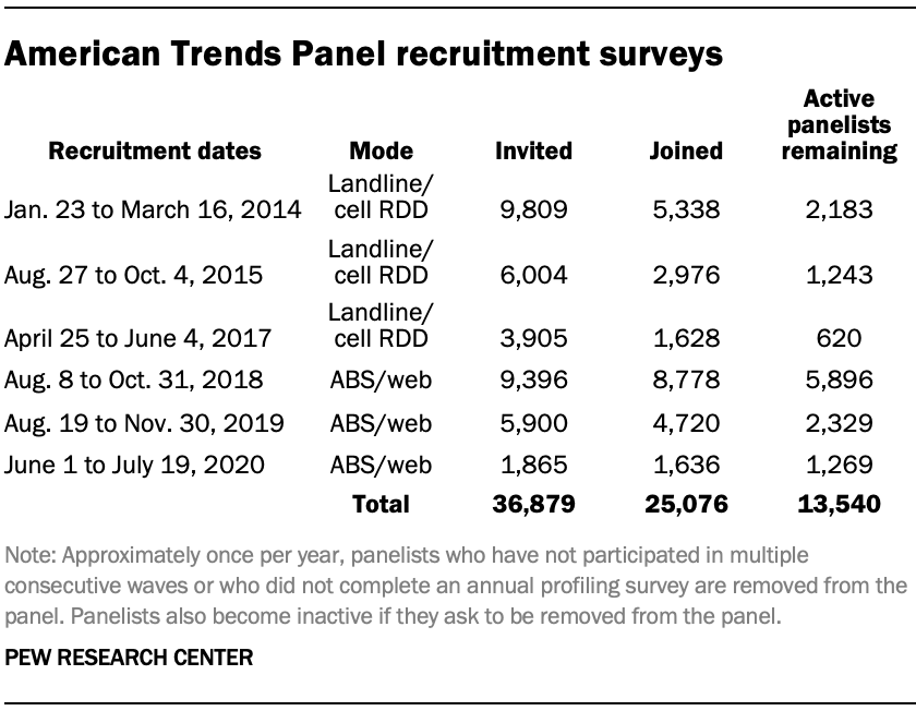In August 2018, the ATP switched from telephone to address-based recruitment. Invitations were sent to a random, address-based sample of households selected from the U.S. Postal Service’s Delivery Sequence File. Two additional recruitments were conducted using the same method in 2019 and 2020, respectively. Across these three address-based recruitments, a total of 17,161 adults were invited to join the ATP, of whom 15,134 (88%) agreed to join the panel and completed an initial profile survey. In each household, the adult with the next birthday was asked to go online to complete a survey, at the end of which they were invited to join the panel. Of the 25,076 individuals who have ever joined the ATP, 13,540 remained active panelists and continued to receive survey invitations at the time this survey was conducted.
