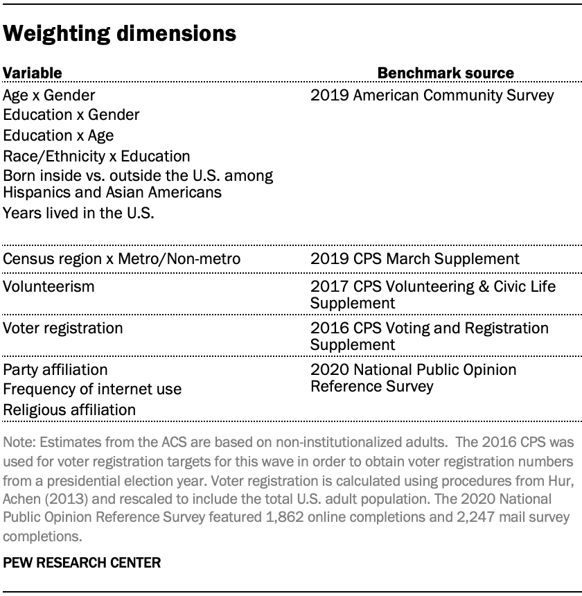 The ATP data was weighted in a multistep process that accounts for multiple stages of sampling and nonresponse that occur at different points in the survey process. First, each panelist begins with a base weight that reflects their probability of selection for their initial recruitment survey (and the probability of being invited to participate in the panel in cases where only a subsample of respondents were invited). The base weights for panelists recruited in different years are scaled to be proportionate to the effective sample size for all active panelists in their cohort. To correct for nonresponse to the initial recruitment surveys and gradual panel attrition, the base weights for all active panelists are calibrated to align with the population benchmarks identified in the accompanying table to create a full-panel weight.