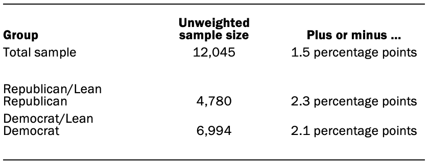 Data in this report is drawn from the panel wave conducted March 8 to March 14, 2021. A total of 12,045 panelists responded out of 13,540 who were sampled, for a response rate of 89%. This does not include five panelists who were removed from the data due to extremely high rates of refusal or straightlining. The cumulative response rate accounting for nonresponse to the recruitment surveys and attrition is 4%. The break-off rate among panelists who logged on to the survey and completed at least one item is 1%. The margin of sampling error for the full sample of 12,045 respondents is plus or minus 1.5 percentage points.