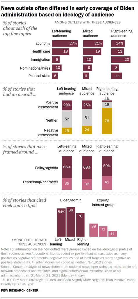 Overall, 32% of stories about the Biden administration had a negative assessment, while 23% had a positive one and 45% were neither positive nor negative. But those numbers varied widely by types of media outlets. Fully 78% of the stories from outlets with predominantly right-leaning audiences carried a negative assessment. That stands in stark contrast to the 19% of stories with a negative assessment from outlets with left-leaning audiences and about a quarter of stories (24%) from outlets with a mixed audience.