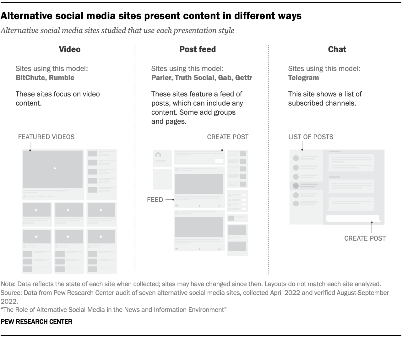 Sites also differ in how they organize their feed. Of the four sites that use this layout, three organize content in a chronological feed, in which the most recent posts are shown first. Gab offers both a chronological feed and an algorithmic feed that shows trending posts (some sites list trending posts separately).