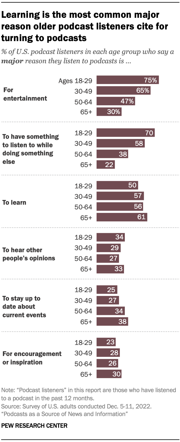 At least half of podcast listeners across all age groups say learning is a major reason they listen to podcasts, but this is the most common reason cited by those 65 and older, at 61%. And older podcast listeners are more likely than those 18 to 29 and 30 to 49 to say staying up to date with current events is a major reason they listen to podcasts: About four-in-ten listeners 65 and older (38%) say this, compared with a quarter of those 18 to 29.