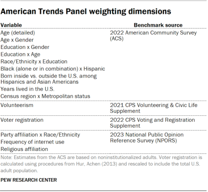 The ATP data is weighted in a multistep process that accounts for multiple stages of sampling and nonresponse that occur at different points in the survey process. First, each panelist begins with a base weight that reflects their probability of selection for their initial recruitment survey. These weights are then rescaled and adjusted to account for changes in the design of ATP recruitment surveys from year to year. Finally, the weights are calibrated to align with the population benchmarks in the accompanying table to correct for nonresponse to recruitment surveys and panel attrition. If only a subsample of panelists was invited to participate in the wave, this weight is adjusted to account for any differential probabilities of selection.
