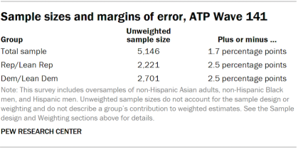 Data in this report is drawn from ATP Wave 141, conducted from Jan. 22 to 28, 2024, and includes an oversample of non-Hispanic Asian adults, non-Hispanic Black men and Hispanic men in order to provide more precise estimates of the opinions and experiences of these smaller demographic subgroups. These oversampled groups are weighted back to reflect their correct proportions in the population. A total of 5,146 panelists responded out of 5,604 who were sampled, for a response rate of 92%. The cumulative response rate accounting for nonresponse to the recruitment surveys and attrition is 3%. The break-off rate among panelists who logged on to the survey and completed at least one item is 1%. The margin of sampling error for the full sample of 5,146 respondents is plus or minus 1.7 percentage points.