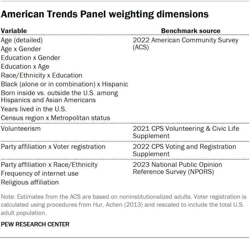 The ATP data is weighted in a multistep process that accounts for multiple stages of sampling and nonresponse that occur at different points in the survey process. First, each panelist begins with a base weight that reflects their probability of selection for their initial recruitment survey. These weights are then rescaled and adjusted to account for changes in the design of ATP recruitment surveys from year to year. Finally, the weights are calibrated to align with the population benchmarks in the accompanying table to correct for nonresponse to recruitment surveys and panel attrition. If only a subsample of panelists was invited to participate in the wave, this weight is adjusted to account for any differential probabilities of selection.