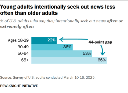 When asked how often they seek out the news, about one-in-five young adults (22%) say they do so often or extremely often. Older adults are much more likely to intentionally seek out news.